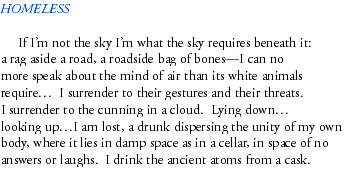 As an act of goodwill and for poetry - Longhouse is sending out each month complete publications - online - of one poet (or more) we have published in booklet, broadside or postcard form for everyone to share. It's a way of giving back to many of you who have sent to us poems, letters, purchases and the same goodwill over the years. The series will fly in under the banner of our Woodburners We Recommend. It should also be felt as a certain warmth in memory to all our close and dear poetry comrades passed along - each one becoming more of a loss. Each monthly booklet will also be available for purchase from Longhouse. Issued in a very limited keepsake edition of 50 copies. Starting in 2006 we will begin to reissue and present past issues from Longhouse of select poets. For those readers that travel back as far as 1972 when Longhouse began, you know poetry was released like bandits by the day, by the week, by the month, and always free. We have never taken on grants and meant poetry to be seen & heard & on poetry terms. From 2006, into the Infinite, and within the universal cyber cosmos, we would like to share multiple poets with you....and only ask that you share them further.